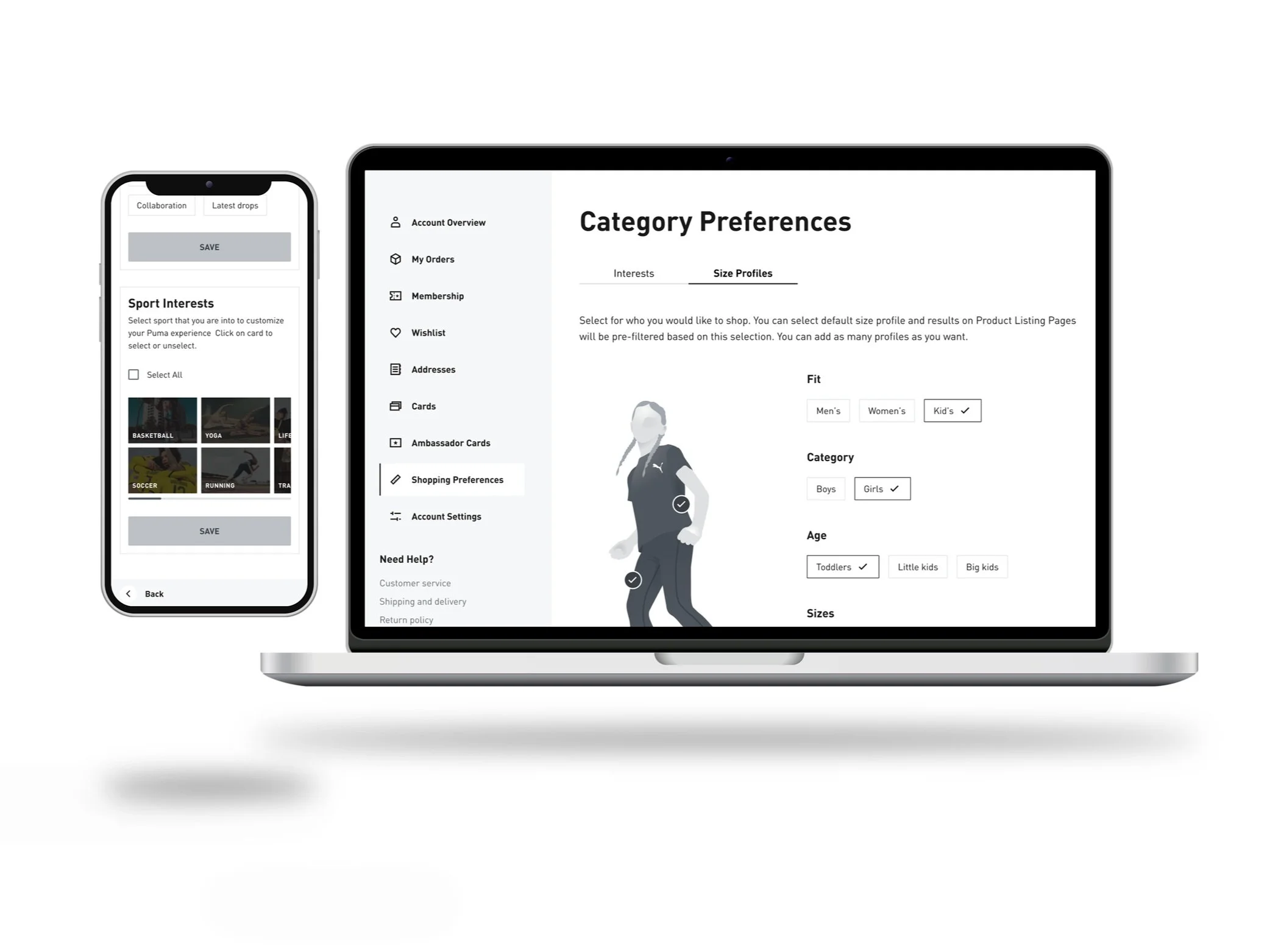 Based on user research, the goal was to build out a preference center where a user could select their shopping interests and log size profiles for friends and family members. This way the company can personalize their experience throughout their shopping journey, email, and SMS. Key Stakeholders involving manager of email marketing, director of marketing, customer success team, and manager of CRM.